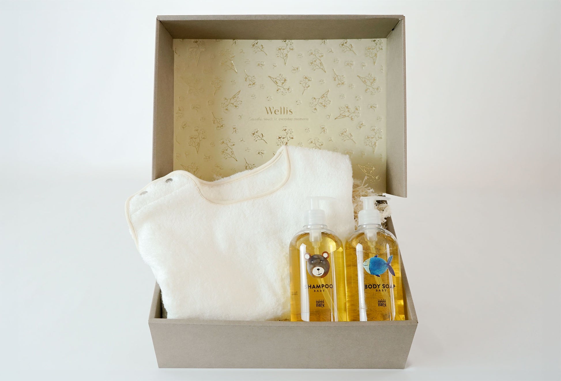 Wellis BABYのオーガニックスーピマコットンを使用し、ロングパイルで肌触りの良いスリーパーと、ママベビーのバスタイムにうれしいベビーシャンプーとボディーソープをセットにしたギフトセットです。