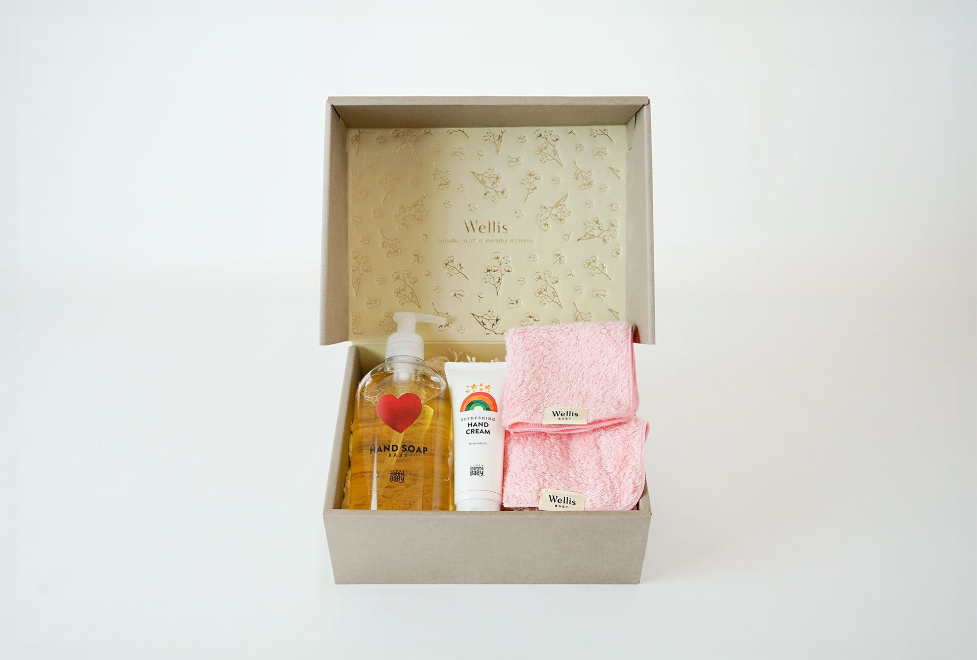 Wellis BABYの繊細なお子様の肌に優しく寄り添うマミータオルとダディータオル、ママの手指を清潔に整えるハンドソープとリフレッシングハンドクリームをセットにしたギフトセットです。お食事前や帰宅後に、小さな手のハンドソープで