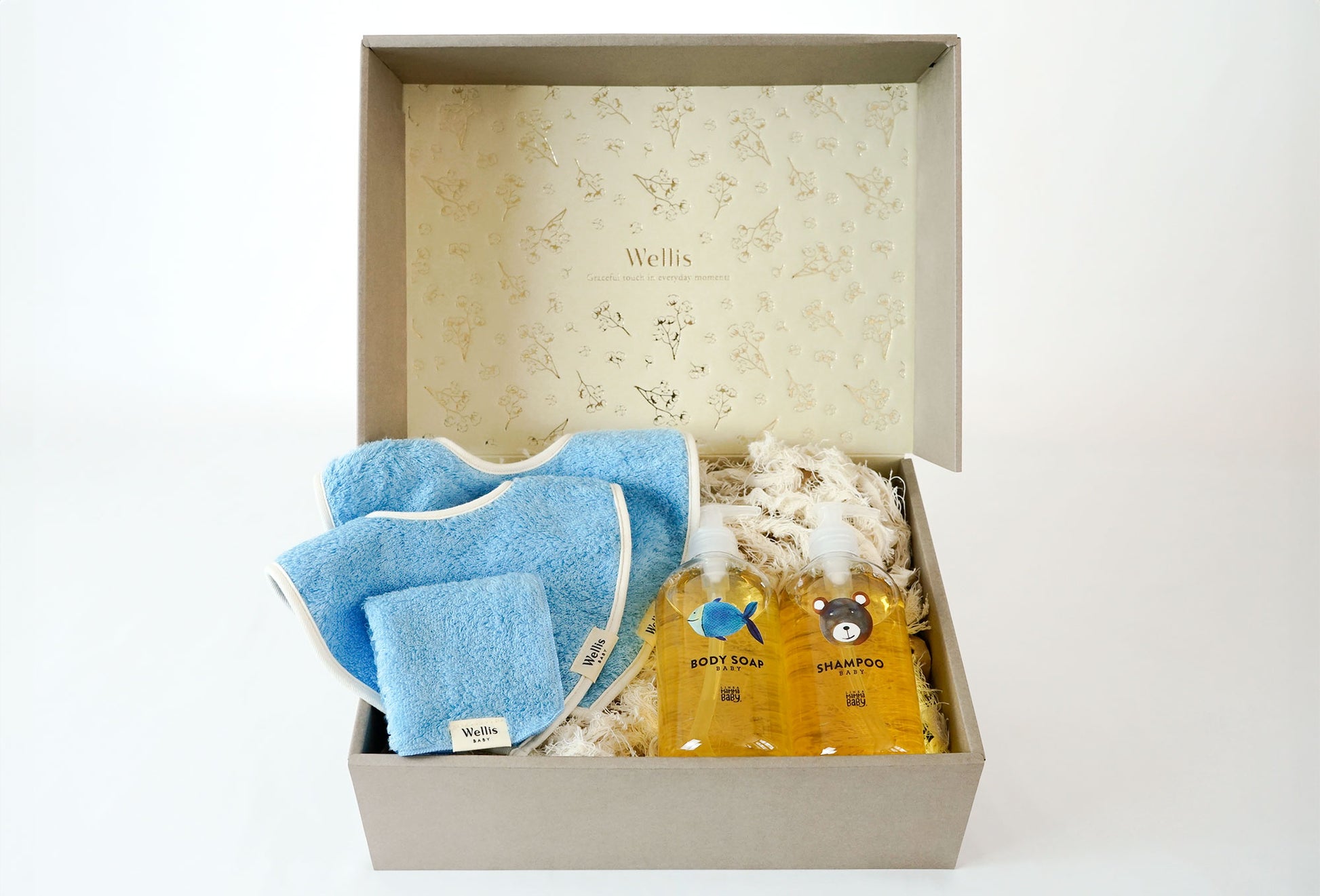 Wellis BABYの優しくやわらかな着け心地のビブ2サイズ、繊細なお子様の肌に優しく寄り添うマミータオルと、ママベビーのバスタイムにうれしいベビーシャンプーとボディーソープをセットにしたギフトセットです。