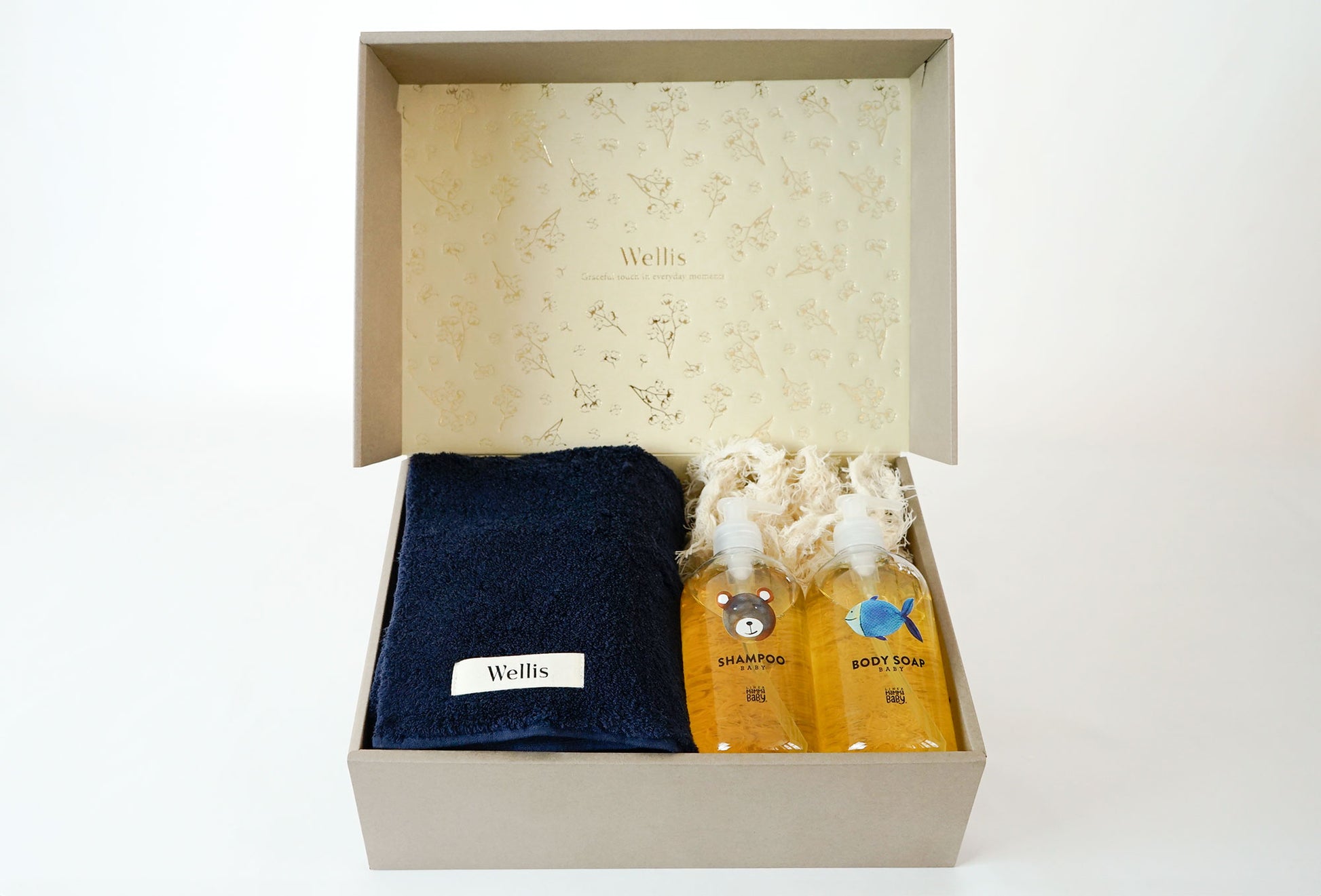 Wellisの『優しく美しい肌ざわり』のタオルと、ママベビーのバスタイムにうれしいベビーシャンプーとボディーソープをセットにしたギフトセットです。