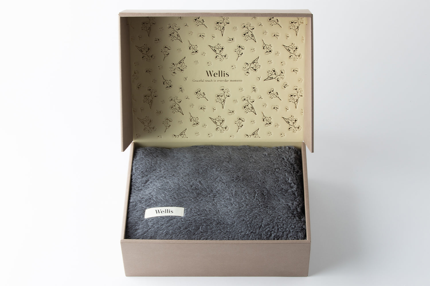 Wellisのブランケットには、オーガニックスーピマコットンを使用しており、特徴として繊維が長く繊細であり、肌ざわりが非常に優れています。イタリア製レピア織機で泉州の熟練タオル職人によって特別な織り方で作ることによって、そのパイルの長さ、ボリュームからは想像が付かない軽くふわりとした質感を実現しました。