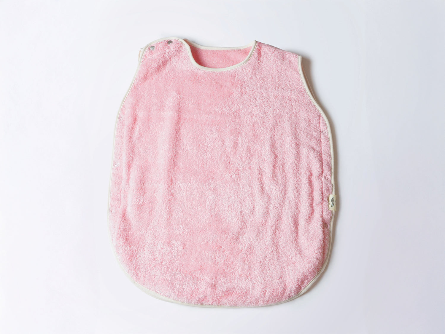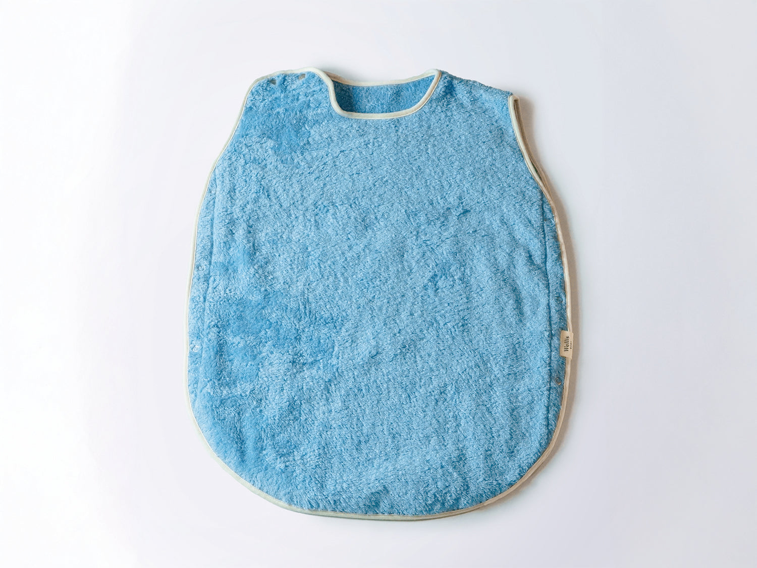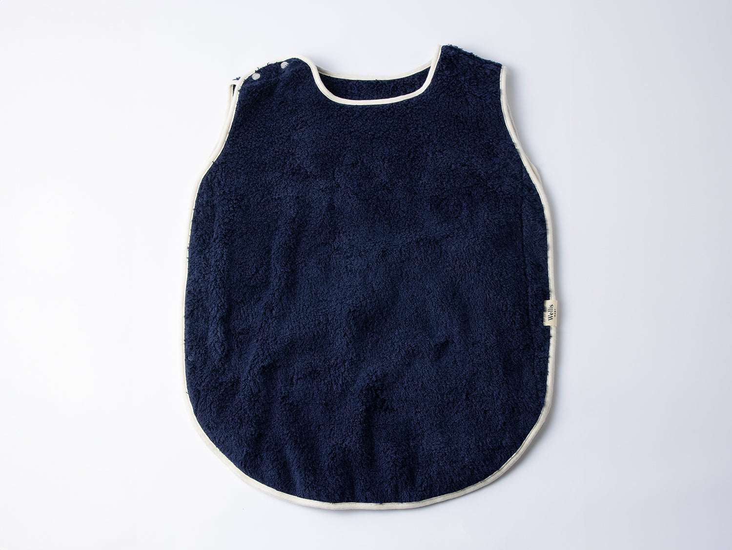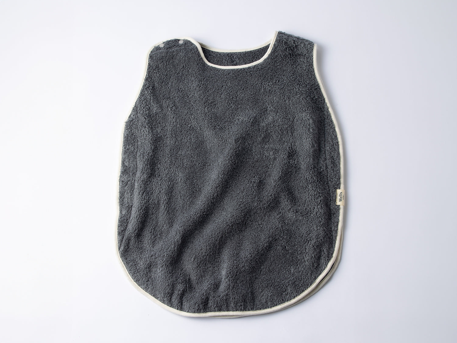 袖がなく、両脇と肩のスナップボタンを外すと大きく開く、着脱させやすいシンプルなデザインです。寝ている時も活発に動くお子様のお布団代わりとしてもご愛用いただけます。